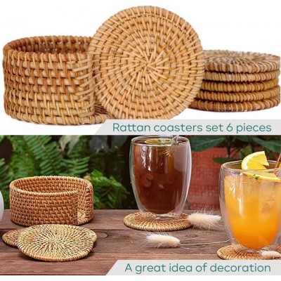 Handmade Natural Rattan Coasters, Bohemian Weave, Set of 6 with Holder | Reusable, Heat-Resistant Trivets—Round Woven Mats